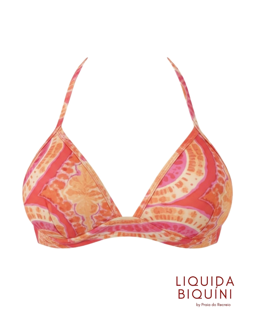 Top de biquíni com base abaixo do bojo, que oferece maior sustentação e encaixe seguro. Bojo, alças finas e estampa colorida que valoriza o look de praia ou piscina. Caimento confortável e acabamento macio.