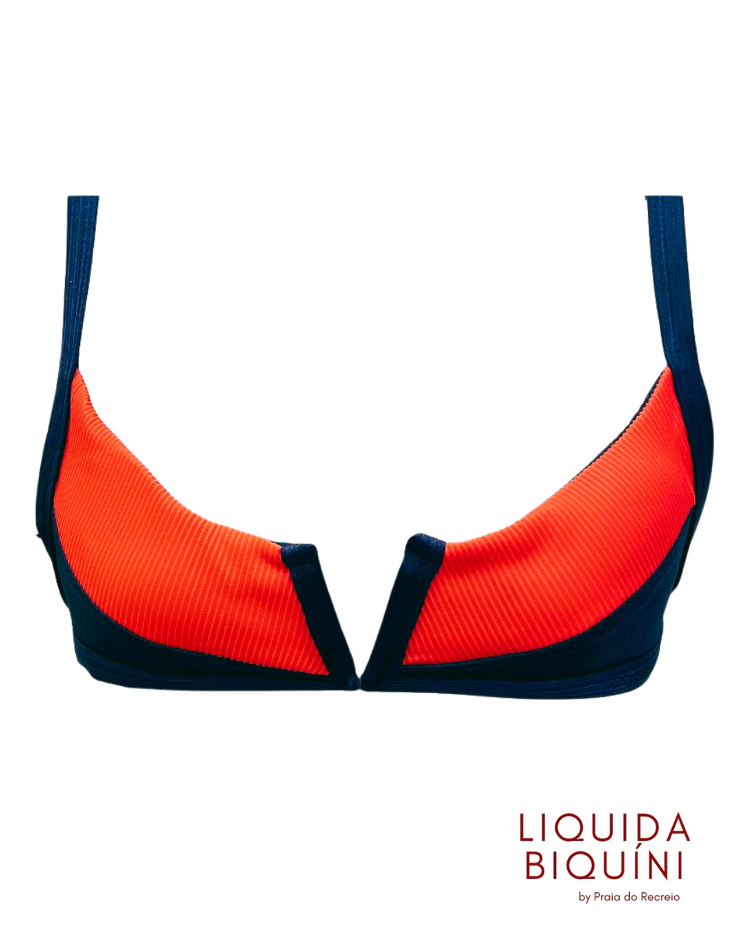 Top de biquíni Tala V na cor laranja e marinho, com detalhe frontal em V que valoriza o colo e confere visual moderno e elegante. Modelagem confortável, com ótimo ajuste ao corpo e acabamento macio — ideal para praia ou piscina.