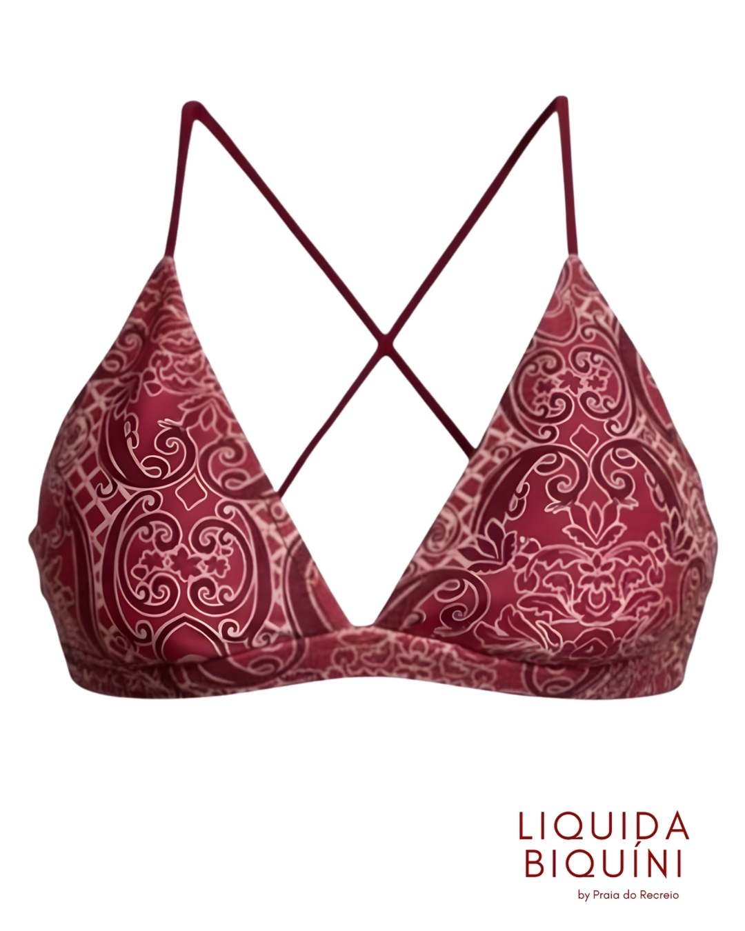 Top de biquíni Transpassado Cruzado – Estampa Renda Vinho. Faixas que cruzam, oferecendo encaixe seguro e confortável. Modelagem que valoriza o colo e garante liberdade de movimento para praia ou piscina.