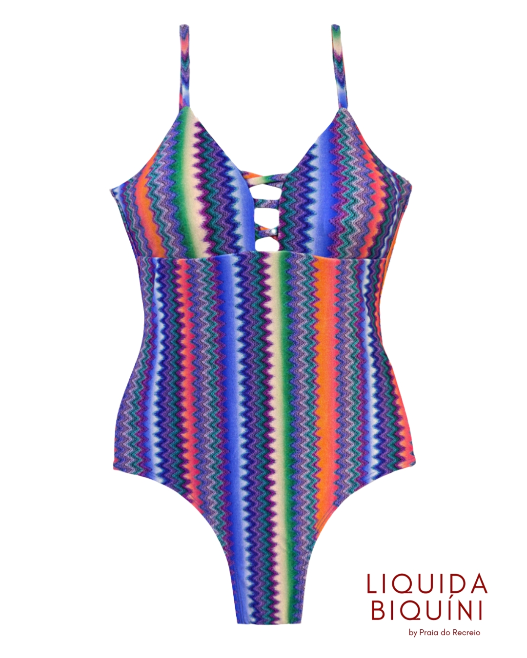 Maiô estampado com tiras cruzadas no decote. Tecido macio com ótima elasticidade e caimento que valoriza a silhueta, garantindo conforto na praia ou na piscina.