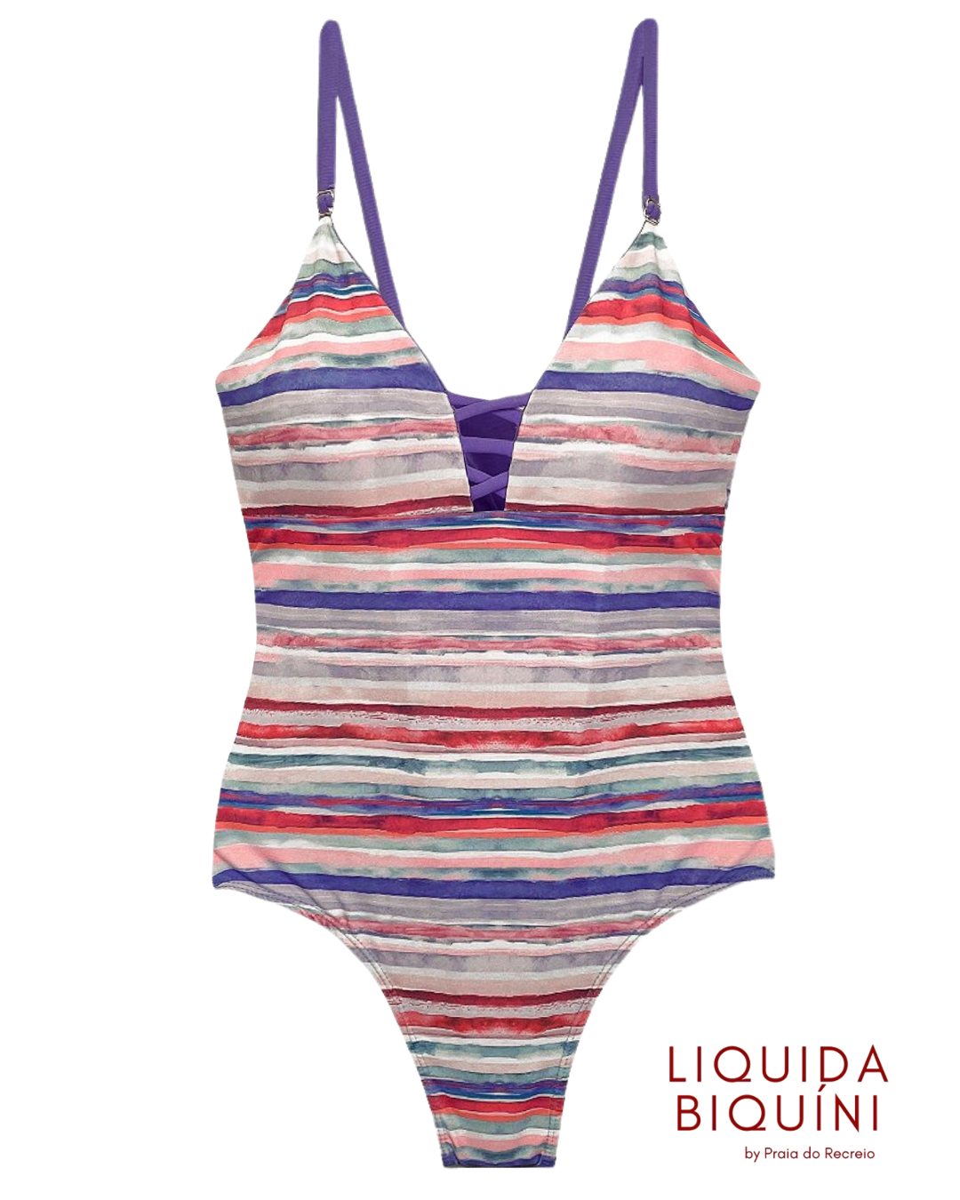 Maiô estampado com tiras cruzadas no decote. Tecido macio com ótima elasticidade e caimento que valoriza a silhueta, garantindo conforto na praia ou na piscina.