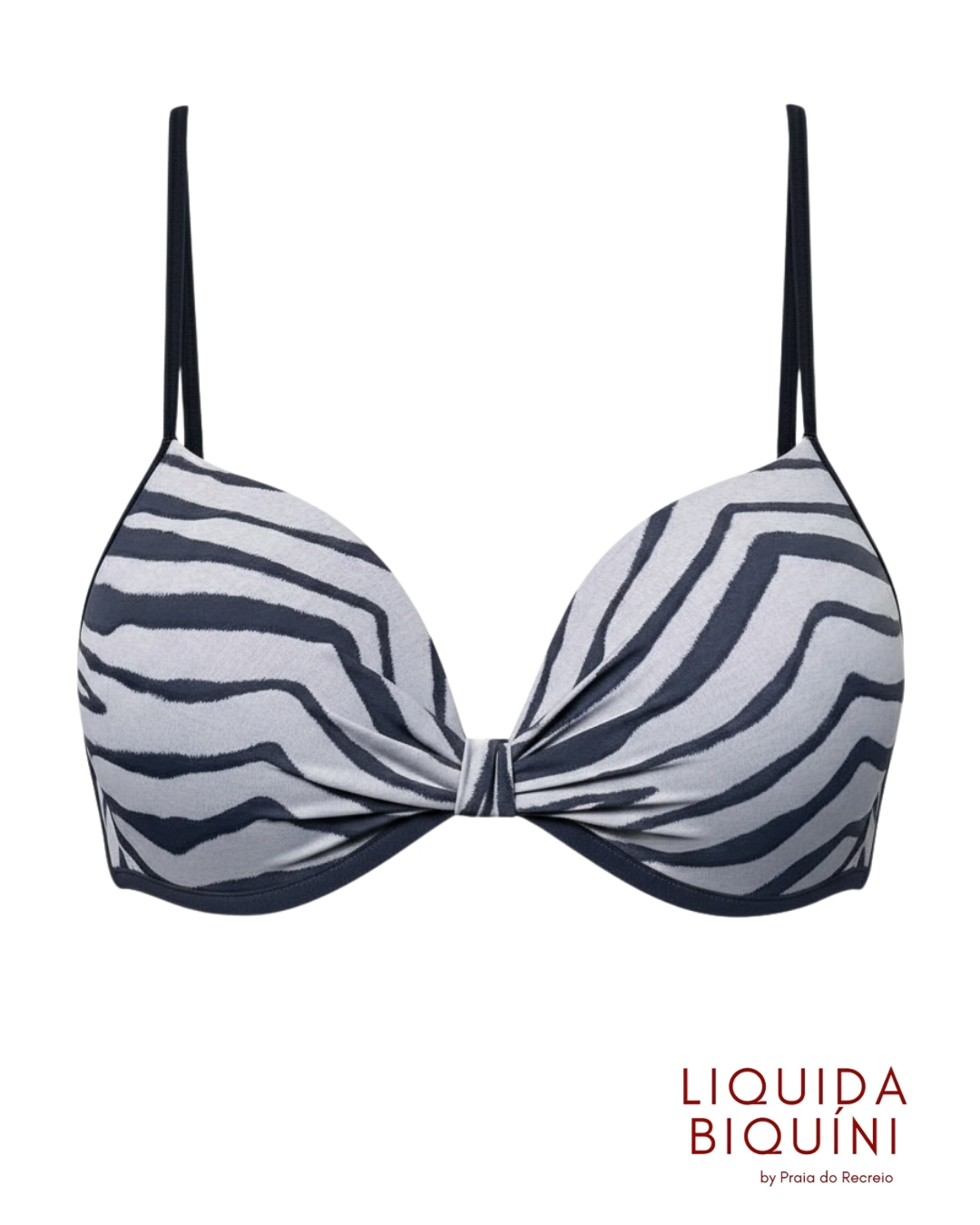 Top de biquíni meia-taça com amarração fixa no decote, que realça o busto e traz um toque feminino. Estampa selvagem e modelagem de cobertura média, oferecendo sustentação confortável para praia ou piscina.